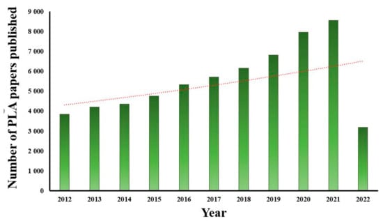 Biocomposites are now receiving more attention in polymer composites’ materials because of the inherent characteristics of biodegradability [24]. Additionally, the number of papers published on PLA has witnessed an increasing trend in the last 10 years, as shown in Figure 1, demonstrating the importance of PLA in the field of composites. The reason behind a smaller number of papers being published in 2022 is because papers were counted through the month of April. A huge amount of biopolymers is extensively used in the manufacturing of biocomposites. These biocomposites are fabricated by the combination of various biopolymers and biofibers. Various types of biopolymers have been used as a matrix material with different reinforcements to fabricate biocomposites. PLA is mainly preferred among biopolymers due to its adequate compatibility with various natural reinforcements and comparable mechanical and physical properties [25]. It is a lactic acid formed by the fermentation of carbohydrates (found in corn, which is a cheap source) carried out by bacteria using the Lactobacillus genus (an optimized strain). It is economically feasible and can be produced at the cost of USD 0.25/pound [26]. Polylactic acid has several advantages, e.g., it is a source of agriculture-based products, helps fix the substantial amount of CO2 (a greenhouse gas), requires less energy in processing, is easily recycled into lactic acid without much effort, and has tailored physical–mechanical properties through material modifications [27]. Hence, a comprehensive and informative review article is necessary to address all the important issues comprising the properties of PLA and its significance; its composites fabricated via various processes by incorporating different fibers, fillers, and nanofillers; their respective characterization; and, finally, its scope in various industries.