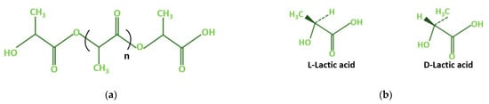 Polylactic acid belongs to the family of poly-α-hydroxy acid, a type of linear aliphatic thermoplastic polyester, as shown in Figure 2a. The enantiomeric form of PLA is divided into three categories, viz., levorotatory (L-), dextrorotatory (D-), and meso (a combination of L- and D-), as shown in Figure 2b [41]. The type of PLA formed will depend on the source form and the process followed in making it. A subclass of meso, called “racemic mixture”, can also be formed if the ratio of L- and D- present in the mixture is equal. The polymer formation using L-, D-, and meso enantiomers is termed poly L lactic, poly D lactic, and poly meso lactic, respectively [42].