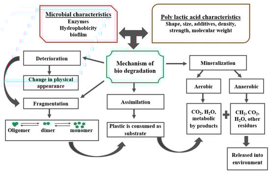 Biodegradation of PLA takes place naturally in the presence of algae, fungi, and bacteria. The chemical structure of the PLA breaks into H2O, CO2, and inorganic compounds, as shown in Figure 4. Meanwhile, some amount of biomass is also produced during the process, which can be utilized as manure. The term biodegradability becomes identical to compostability when the residue obtained is nonvisible and nonpoisonous [46]. Biodegradability is only ensured under a specific set of conditions governed by temperature, pressure, and humidity. Unfavorable environmental conditions will slow down the rate of biodegradation, which may differ from the natural biodegradation in terms of the obtained residue even in the presence of enzymes. Biodegradation of PLA occurs in two phases, heterogenous (surface degradation) and homogenous (intramolecular degradation). The degradation of any polymer takes place in three ways: (1) scission through an intersectional chain, (2) scission through the main chain, and (3) scission through a side chain. For PLA, biodegradation transpires through the emission of ester bonds, breaking down the long polymer chain into short oligomers, monomers, and dimers precisely known as carboxylic acid and alcohol. These short units can penetrate through the cell wall of microorganisms, leading to their biochemical degradation. Factors influencing the biodegradation of PLA are melting point temperature, glass transition temperature, crystal structure, molecular weight, chemical affinity, surface area, etc. For instance, PLA with higher molecular weight degrades slowly compared to PLA with lower molecular weight. The higher the melting point of PLA is, the lower will be its rate of degradability [47].