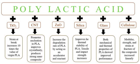 Fully biodegradable nanocomposites can be made by reinforcing naturally occurring biofibers at the nanoscale in PLA. Cellulose and lignin are the two biofibers that can bring significant changes in the properties of PLA. Nanocomposites prepared via a melt screw extruder containing short cellulose microfibrils and PLA in the presence of a plasticizer exhibited improved mechanical strength compared to pure PLA [181]. Organic solvents, such as esters, ethers, ketones, etc., can be mixed in the nanocomposites to disperse the cellulose microfibrils uniformly in the matrix of the PLA [182,183]. Organic solvent decreases the hydrogen bonding between the cellulose–cellulose microfibrils and allows easy fiber separation [184], resulting in homogenously dispersed nanocomposites. Enhanced mechanical and thermal properties of cellulose–PLA nanocomposites prepared via the stacking process can also be achieved by the treatment of fiber [185]. The cell wall of plants is composed of a large number of aromatic compounds called lignins. High-quality lignin can be extracted from almond shells by the organosolv method. The treatment of lignin with acetylation results in an improvement in strength and stiffness [186]. Nanocomposites based on unmodified lignin and PLA yielded improved thermal and mechanical properties [187]. The summarized effect of a nanofiller on the properties of PLA is shown in Figure 10. From the literature, it was revealed that PLA shows greater improvement in strength when reinforced with fibers as compared to fillers. Strength can be increased up to two fold by mixing aluminum triflate. However, rice husk filler degraded the strength of PLA due to a lack of intermechanical bonding.