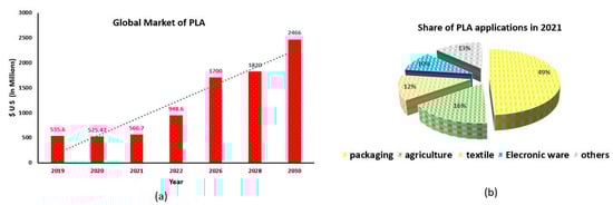 Showing (a) forecasted trend of global market size of PLA and (b) weightage of various PLA applications in 2021 [214].