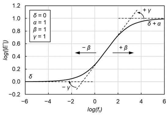 where δ′, α′, β′, γ′ and λ are the fitting parameters. λ characterizes the asymmetric characteristics shown in Figure 3. δ′ and δ′ + α′ represent the minimum and maximum values of |E*|, respectively. β′ and γ′ describe the shape of the GLS model.