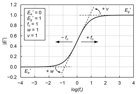 where is the equilibrium modulus representing the minimum modulus, is the glassy modulus representing maximum asymptotic modulus, fc is the location parameter with dimensions of frequency, v and w are fitting parameters and describe the shape of the model as shown in Figure 4.