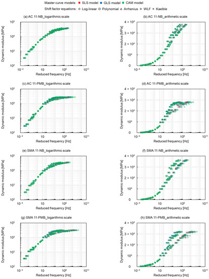 To construct the master curves deriving from the experimental data, the nonlinear least squares regression analysis was integrated in the Microsoft Excel Solver tool. The Sum of Square Error (SSE) between measured values after shifting, |E*|measured, and predicted values, |E*|predicted, as shown in Equation (10) was used for the fitting procedure.