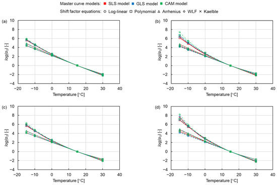 Shift factors of (a) AC 11-NB, (b) AC 11-PMB, (c) SMA 11-NB and (d) SMA 11-PMB.