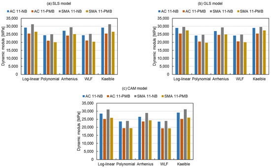 The modelling values of the dynamic modulus at the reduced frequency of 10−2 Hz (Tr = 15 °C) are given in Figure 8 and have a similar trend as the results at 104 Hz, which can also be divided into the same two categories. The former one has an average 19% higher dynamic modulus than the latter one. The results of Figure 7 and Figure 8 indicate that the modelling values of dynamic modulus fitted by the log-linear equation, Arrhenius equation and Kaelble equation are approximately 20% higher than the ones fitted by the polynomial equation and the WLF equation, both at high and low reduced frequencies.
