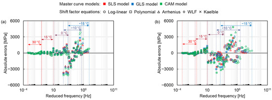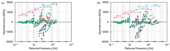 After comparing the master curves constructed by different models, the error analysis of each model and shift factor equation was carried out. The absolute errors of the dynamic modulus between the modelling values fitted by the three master curve models and the five shift factor equations, and the measured values are shown in Figure 9, where the colour and shape of the marker represent the same master curve models and shift factor equations as in Figure 5. The absolute error is small at high temperatures and relatively big at the temperature range between −15 °C to 0 °C for all mixtures. The maximum absolute error at −10 °C can be explained by the connection between viscoelastic stage and elastic stage, which in turn changes the mechanical response of mixtures. As the temperature continues to decrease (the reduced frequency increases), the absolute error becomes smaller again at −15 °C (higher reduced frequency). This result is attributed to the elastomer of asphalt mixture at very low temperature, resulting in a constant dynamic modulus.
