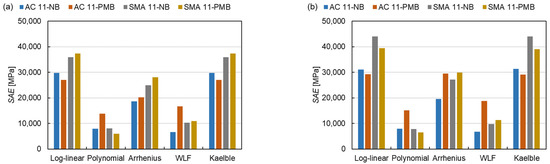 The shift factor equation has more influence on the Sum of Absolute Error (SAE) than the master curve models, as shown in Figure 10. There are 15 master curve model-shift factor equation combinations for 4 types of mixtures resulting in a total of 60 fitting procedures. The average SAE of the fitting procedures with the controlled fitting condition are used for comparing the distinctions of the master curve models, shift factor equations and asphalt mixture types as expressed in Equation (14).
