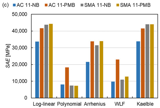 where is the average SAE and n is the number of fitting procedures. The of the fitting procedures with the SLS model, the GLS model and the CAM model are 21,598 MPa, 23,851 MPa and 27,244 MPa, respectively. This indicates that the SLS model has the smallest absolute error, the CAM model has the largest absolute error and the GLS model is in between. Regarding the shift factor equations, the SAE for the log-linear equation and the Kaelble equation are similar and classified as class 1, the SAE for the polynomial equation and the WLF equation are close and grouped into class 2 and the value for the Arrhenius equation lies between them as class 3. The absolute error of class 1 is more than twice that of class 2. The results reveal that the SLS model and the polynomial function have the smallest absolute errors in three master curve models and five shift factor equations, respectively. For class 1, the absolute error of SMA mixtures is larger than the one of AC mixtures. Comparing four types of mixtures, the AC 11-PMB has the highest absolute error of class 2.
