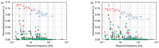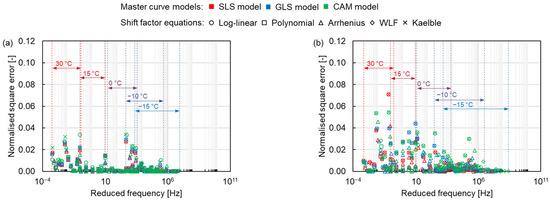 Since the dynamic modulus of asphalt mixtures is distinct at different temperatures and frequencies, it is difficult to compare the error under the same condition over the full frequency range. The normalised square error was analysed to compare different models and shift factor equations at the same condition. From Figure 11, the normalised square error is larger at high temperatures and smaller at low temperatures, contrary to the results of the absolute error, which reflects the error of dynamic modulus at high temperatures. The maximum normalised error appears at the high temperature of 30 °C. As the temperature increases, the asphalt transitions to a viscous flow state, and its dynamic modulus is more obviously affected by the loading conditions, becoming unstable, resulting in an increasing normalised square error. Furthermore, the distinction between different asphalt mixtures can also be found. The normalised square error for asphalt mixtures containing PMB is relatively higher than the one for asphalt mixtures containing NB. Compared to the NB, the polymer molecular in the PMB also provides a portion of the stiffness modulus for the asphalt mixture. The complex connection between the polymer molecular and the asphalt binder, such as the composition and distribution of the polymer molecular in the asphalt binder, determines the stiffness modulus of the asphalt mixture [37,38]. Therefore, the dynamic modulus change of the asphalt mixture containing PMB is more complicated than that of the NB asphalt mixture, resulting in a larger error. Otherwise, the SMA mixtures have a higher normalised square error than the AC mixtures. The SMA mixture contains more coarse aggregates than the AC mixture, leading to more particle angularity. The greater the particle angularity, the higher the stiffness modulus of the asphalt mixture [39]. Thus, the change of the dynamic modulus of the SMA mixture is more complex than that of the AC mixture, resulting in a larger error.