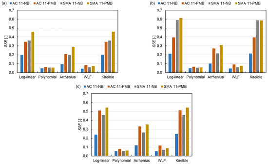 where is the average SSE. The of the SLS model is 0.20, which is also smaller than those of the GLS model (0.25) and the CAM model (0.26). Based on SSE values, five shift factor equations are divided into three classes, the same as the classification in Section 3.2.1. The of class 1 is around five times that of class 2. The results show that the SLS model and the polynomial function have the smallest normalised square errors in the three master curve models and the five shift factor equations, respectively. The mixtures containing PMB have a lower SSE than the mixtures containing NB, which indicates that the fit of the model for NB is better than the one for PMB, which can be explained by the effect of the PMB structure on the dynamic modulus of the asphalt mixture.