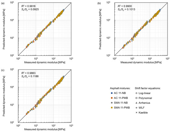 Lower Se/Sy and higher R2 values indicate better goodness between predicted and measured data. Based on the criteria of the goodness of fit from previous research [36], Se/Sy and R2 of this research are lower than 0.35 and higher than 0.90, respectively, which indicates that all results have a good fit.