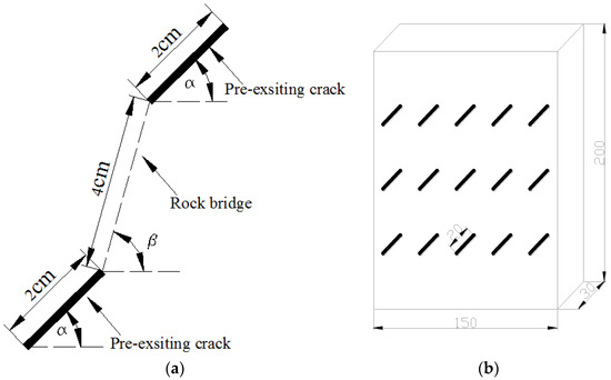 Rocks are natural and heterogeneous materials that contain different defect patterns, and the behavior of “rock-like” materials is determined not only by the properties of the intact rock itself, but also by the presence of discontinuities/defects [1,2,3,4,5]. The cracks in the rock mass not only decrease its strength and stiffness, but also bring a source of initiation of new cracks, which, in turn, may propagate and link with other cracks. Understanding the failure process of fractured rock mass subjected to compression is, therefore, essential in rock engineering, mining engineering, deep underground structures, and geotechnical engineering practice [6,7,8,9,10]. In order to study the physical properties, deformation behavior and mechanical mechanism of rock-like materials during the fracturing process, laboratory loading tests have been extensively employed [11,12,13], and comprehensive research has been conducted to develop crack propagation theories [14,15,16,17] or calculate the stress intensity factors at the crack tips [18,19,20,21], as well as quantifying the relationship between micro damage and the macro-mechanical properties of rock mass [22,23,24,25]. Significant advances have been made in understanding the failure process of fractured rock mass [26,27,28].