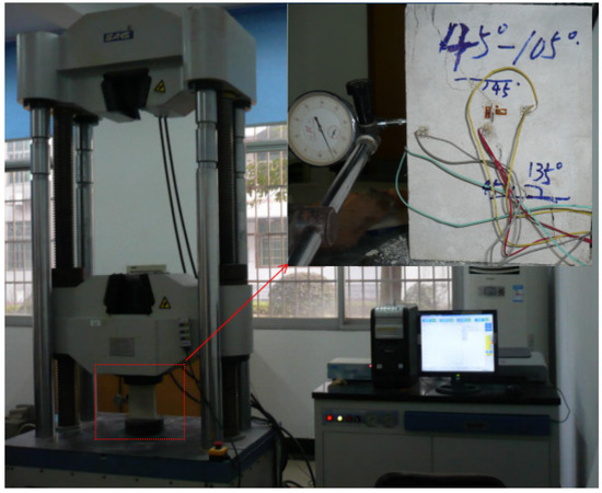 This rock-like material was made of a mixture of water, white cement, and silica sand, and the dimensions of the specimens were 200 mm × 150 mm × 30 mm. Pre-existing cracks were made by inserting iron sheets (0.4 mm × 20 mm) at the early stage of sample preparation, which were removed as the mortar hardened. Details of each specimen are listed in Figure 1 and Table 1, where α is the crack angle, and β is the angle of the rock bridge. The physical parameters of the intact specimens are shown in Table 2. The tests were performed on a servo-controlled uniaxial loading apparatus, as shown in Figure 2. The loading rate was 200 N/s. During the loading process, failure patterns and stress–strain curves were recorded by camera and strain gauges, and a clock gauge was used to measure its transverse deformation.