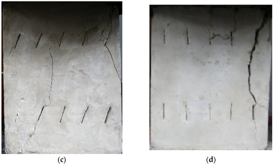 The failure process of the multiple-fractured rock-like specimens with different geometries is shown in Figure 6, Figure 7, Figure 8 and Figure 9. These figures demonstrate that the crack angle plays a leading role in influencing the micro-crack fracturing and failure mode. The influence of crack density, however, depends on the crack angle.