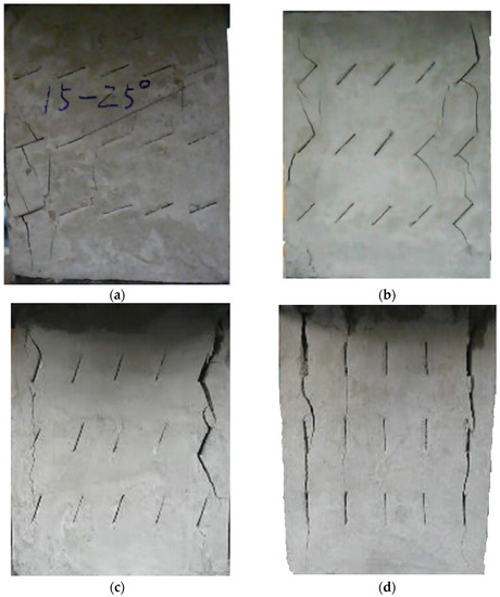 When the number of cracks increased to 15, as shown in Figure 8, different failure patterns were observed. During the initial loading stages, the wing crack appeared at the tip of the crack, and subsequently, a secondary inclined crack’s initiation occurred, which propagated as the load increased. In this case, the cracks at different rows connected till the failure of the specimen. Compared with other experiment groups, the fracture mode of the specimens with crack angles of 25° and 45° were almost the same. For the specimens with crack angles equal to 75°, the wing crack mainly emerged at the tip of the crack in two sides of the specimen. In this case, there was no wing crack appearing in the center of the specimen, and it would be hard to find the micro-crack extension and penetration phenomena at the tip of the crack when the crack angle was 90°.