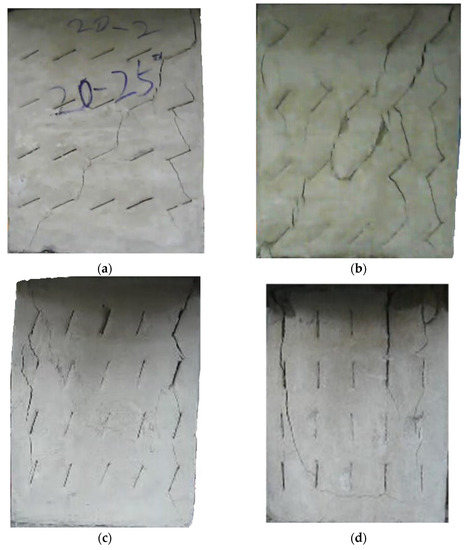 With an increasing number of cracks, as shown in Figure 9, the length of the rock bridge between different rows decreased. The wing crack emerged earlier compared with the specimen with 15 cracks, and there were lesser secondary inclined cracks produced. As the load increased, the wing crack on the diagonal between different rows with the same crack direction expanded faster and coalesced. Compared with other experiment groups, the fracture mode of the specimens with crack angles of 25° and 45° were very much the same, and for the specimens with crack angles of 75°, the wing crack mainly emerged at the tip of the crack in two sides of the specimen and caused the specimen’s failure. However, there were some wing cracks that appeared in the center of the specimen. Similar to the previous cases, it would be hard to find the micro-crack extension and penetration phenomena at the tip of the crack when the crack angle is 90°.