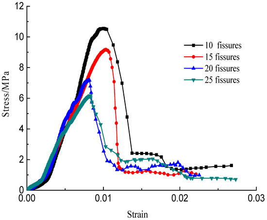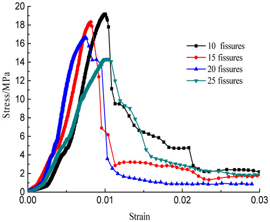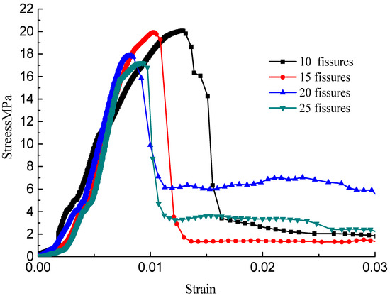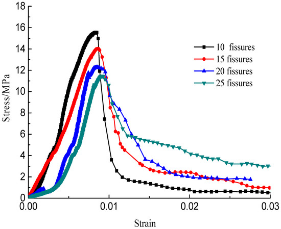The stress–strain curves during the failure process are shown in Figure 10, Figure 11, Figure 12 and Figure 13; there are micro-cracks initiating and propagating as the load increases, and the stress–strain curve showed a post-peak softening, and this softening behavior had a direct correlation with the crack development. The crack density merely influenced the transfixion pattern. Compared to the wing crack failure, a rubbing effect was observed on the shearing surface of the specimens, and there was no major strength degradation, especially for specimens with a crack angle of 45°. Meanwhile, the increase in the crack angle resulted in less intense post-peak softening behavior, the stress–strain curves changed from multi-peak values to single-peak values and the specimens led to brittle failure, but the ductility of the specimen was reinforced.