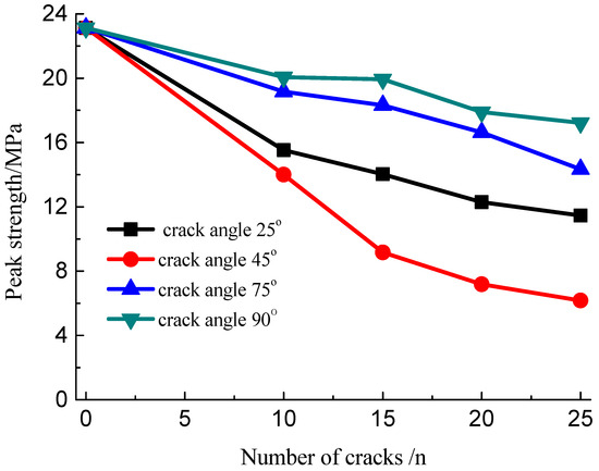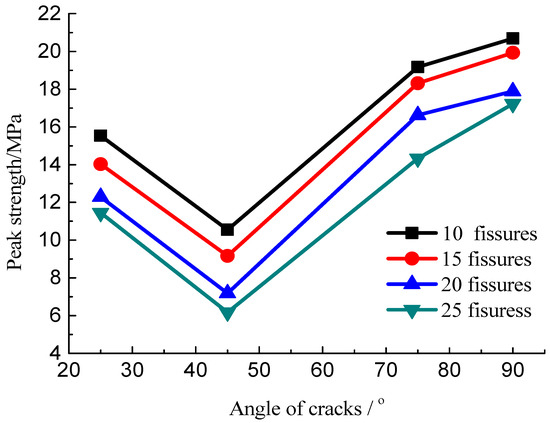 The developed cracks will lead to strength weakening. The relation curves of the peak stress with different numbers of fissures and angles of the cracks are obtained, as shown in Figure 14 and Figure 15. These data suggest that the peak strength of the specimens with multiple fissures decreased initially and then increased with increasing fissure inclination angle. When the fissure inclination angle was 45°, the peak strength was the minimum, and the strength reduction in these specimens was of the order of 60% compared with the intact ones; when the inclination angle increased, the strength increased with the increase in the crack angle. Meanwhile, the increase in the density of fissure distribution would result in a decrease in the peak strength because it is a process of evolution and accumulation of damage to the rock mass as the crack number increased progressively.