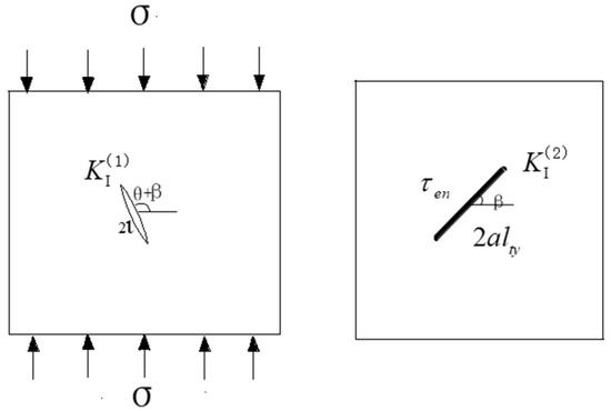 Based on the fracture mechanics theory, the stress intensity factor at the wing crack tip can be simplified into the superposition of the two stress intensity factors, as shown in Figure 17: