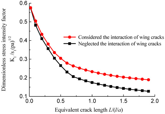 When KI = KIC in Equation (12), the cracks begin to expand. Figure 19 shows the interaction of the multi cracks makes the stress intensity factor at the crack tip larger than that related to a single wing crack.