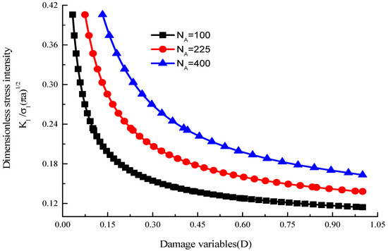 Combining Equations (10), (13) and (14), the relation curves between the damage variables D and stress intensity factor with different crack densities are shown in Figure 21.