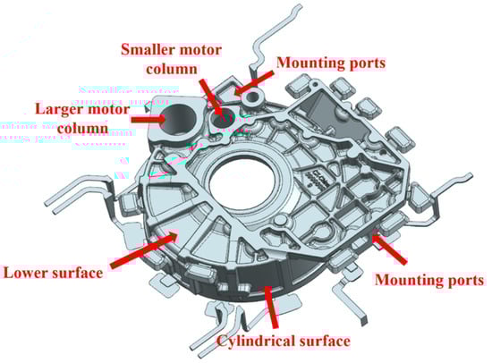 The flywheel housing component is used to connect the engine and the gearbox through the shafts through the two motor columns. Figure 1 shows a diagram of the flywheel housing casting. AlSi9Mg aluminum alloy was selected as the material. The chemical composition is shown in Table 1. The ProCAST software was used to simulate the squeeze casting process for flywheel housing components, and the flow rule for molten metal in the filling process was investigated. Considering the influence of various process parameters on the comprehensive performance of castings, this paper mainly focused on the distributions of the temperature fields, stress fields and defects in the flywheel housing components under different pouring temperatures, mold temperatures, pressure holding times and specific pressures.