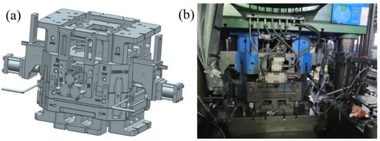Mold for engine flywheel housing component: (a) three-dimensional model; (b) photograph.