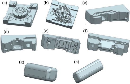 Simplified 3D mold drawing of engine flywheel housing: (a) upper die; (b) lower die; (c) left side die; (d) right side die; (e) rear side die; (f) front side die; (g) left pressure compensation bar; (h) right pressure compensation bar.