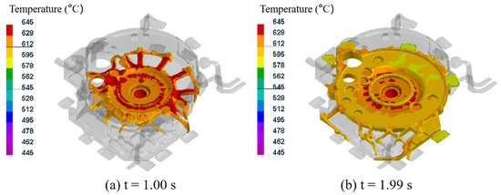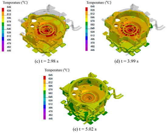 It can be seen that after 1.00 s of filling, the aluminum melt filled the sprue and began to spread from the center to the surrounding areas along the thicker rib on the lower surface of the flywheel housing component (Figure 5a). After filling for 1.99 s, the entire lower end face of the flywheel housing was almost full, and the temperature at the peripheral overflow groove was lower than that at other positions (Figure 5b), because the temperature here decreased rapidly due to the thin peripheral overflow groove [37]. After filling for 2.98 s, the mold filling rate reached 61.9%, and it could be seen that the temperature of the direct contact surface between the aluminum alloy liquid and the die was lower, while the temperature of the non-contact surface was higher (Figure 5c). After filling for 3.99 s, the temperature at the various corners and edges of the flywheel housing was relatively low, dropping to between 552 °C and 578 °C (Figure 5d). After filling for 5.02 s, the filling process was complete for the entire flywheel housing, and the filling rate reached 100% (Figure 5e). At this time, the solid fraction was 6.9%, and the average temperature of the aluminum alloy liquid was 606.4 °C, indicating that the flywheel housing was fully filled and that the aluminum melt still had good fluidity after filling, which made it possible to exert a certain pressure for forced feeding through the lower injection cylinder during the solidification process [27]. The simulation experiments were carried out for 16 groups, and the results showed that the filling process was roughly the same under each process parameter and that all the aluminum alloy flywheel housing castings were completely filled, with no filling dissatisfaction.