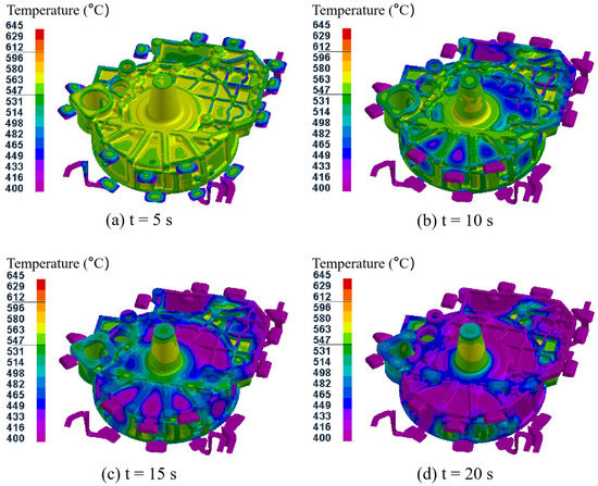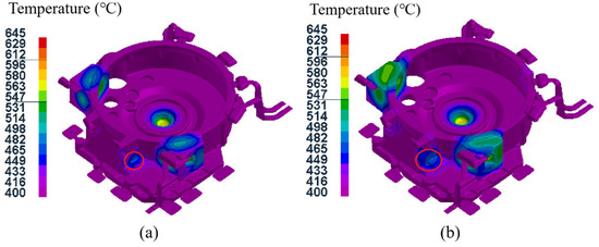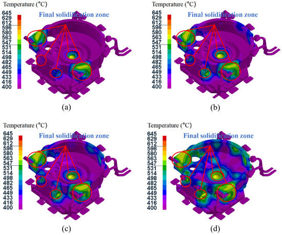 Figure 11 shows the temperature field distribution for test groups 9–12 after the pressure holding process. The pressure holding time for these groups was gradually reduced from 35 s to 20 s. It can be seen that the holding time directly affected the temperature field distribution of the aluminum alloy flywheel housing component after the holding time process. The shorter holding time, the higher the average temperature of the flywheel housing component and the more final the solidification zone. At the end of the holding pressure process, in addition to at the left and right mounting ports with large wall thicknesses and the sprue, there was also a small part of the final solidification zone at the convex platform of the cylindrical surface, where it was easy to produce shrinkage cavities and other defects [44]. A local shrinkage compensation effect could be achieved by adding a local loading device to the small convex platform, to inhibit the generation of shrinkage cavities and other defects in this region.