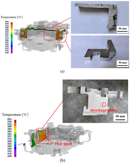 Figure 9 shows the temperature field distribution and the photographs of the cross section at the mounting ports with a local loading device, for test group No. 16 (pouring temperature of 660 °C, mold temperature at level D, pressure holding time of 30 s, specific pressure of 22.66 MPa) after the pressure holding process. Due to the large wall thickness of the mounting ports, it was easy to produce hot spots, and such areas were prone to form defects such as shrinkage cavities and porosity [41,42]. However, it can be seen in Figure 9a that the temperature distribution near the right mounting port was relatively uniform, and there was no obvious hot spot. No obvious shrinkage cavity was found in the photographs of sections of the produced component. In Figure 9b, a small hot spot area was predicted at the left mounting port, and a shrinkage cavity was also found in the section photograph, but the number of defects was small. This proved that the squeeze casting equipment used in this study and shown in Figure 2 could effectively reduce the generation of defects by forcing supplementary pressure at the locations of the left and right mounting ports of the flywheel housing components using a local loading device.