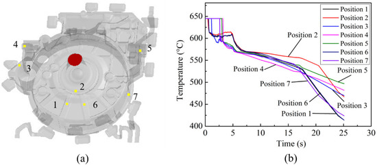 The characteristic points were sampled at seven different positions for the test group No. 1 flywheel housing, as shown in Figure 10a. Positions 1, 2 and 6 were set on the reinforcement rib at the lower surface, position 3 was set next to the larger motor column, positions 4 and 5 were set at the local feeding region and position 7 was set on the cylindrical surface of the flywheel housing. The temperature variation curves with time for the above characteristic points are shown in Figure 10b, where 0~5 s refers to the filling process and 5~25 s refers to the pressure holding process. It can be seen that when the pressure holding process was complete, the temperature at positions 1 and 6 was the lowest, due to the small thickness and the large contact area with the surface of the lower die, leading to faster heat dissipation. The heat dissipation velocity at positions 4 and 5 was less, due to the larger wall thickness, so the temperature was highest at these positions. At position 2, the temperature decreased first but then increased slightly at 4~5 s during the filling process, and the temperature at the end of the pressure holding process was higher than that at nearby positions 1 and 6. This is because position 2 was close to the gate and was first to be filled by the aluminum melt, so the temperature drop occurred first. Then, in the subsequent process of filling the entire mold, the high-temperature molten metal continuously passed through position 2, resulting in a quick recovery in temperature in this region. In addition, because it was closer to the gate, the temperature after the pressure holding process was higher than that at positions 1 and 6 [43]. The results for the temperature–time curves at the characteristic points in Figure 10b were consistent with the analysis of the temperature field distribution at different moments in Figure 6. The solidification rule of the whole flywheel housing component was that the solidification first started in the area away from the gate and then spread to the center of the casting, and the thinner region solidified first, with a higher cooling speed than the thicker regions.
