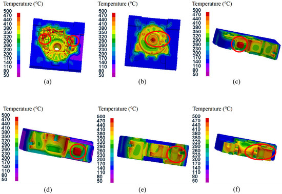 The study analyzed the mold temperature fields of 16 test groups, and the temperature field distribution of each group was roughly the same. Taking test group No. 1 as an example, Figure 13 shows the mold temperature field distribution after the pressure holding process. It can be noted that the mold temperature was unevenly distributed, and the temperature on the surface in contact with the casting increased rapidly, while the temperature in the area away from the casting did not change significantly. The temperatures in regions such as the small convex platform of the lower mold, the diversion cone of the upper mold, the pressure compensation bars of the left and right side molds and the corner of the rear side mold were higher, due to the contact with the casting. Therefore, with repeated use of the mold, the temperature changes in these regions would be relatively large and likely to produce cracks [45,46].