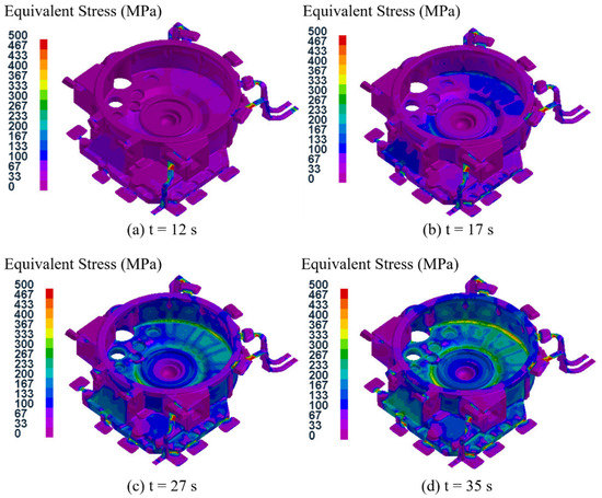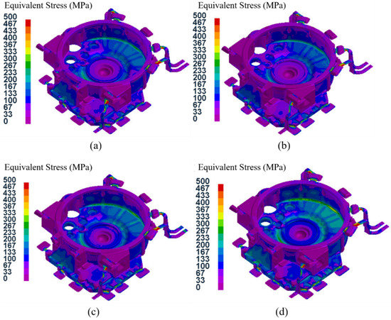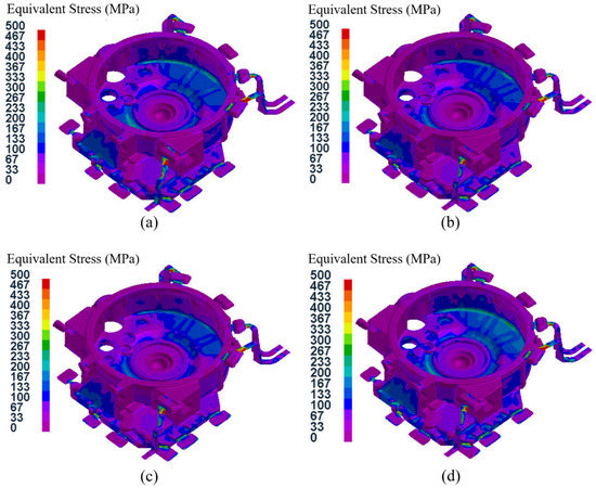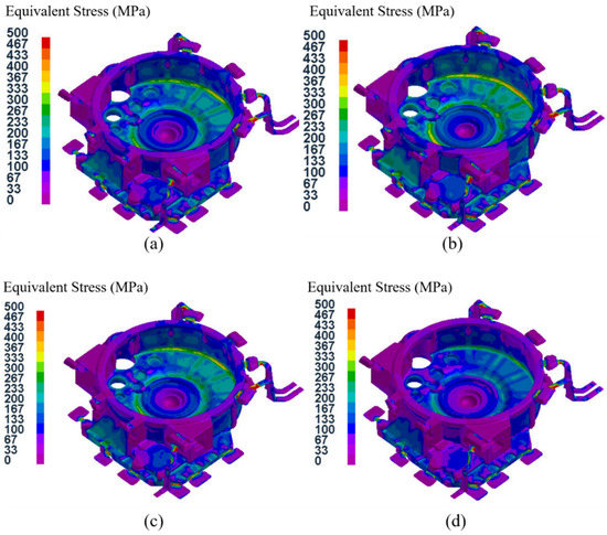 Equivalent stress field distributions of the flywheel housing with pressure holding time of 25 s: (a) test group No. 2; (b) test group No. 8; (c) test group No. 11; (d) test group No. 13.