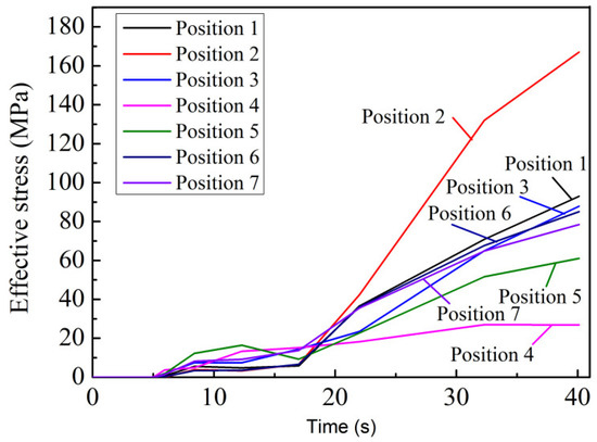 The characteristic points were sampled at seven different positions in test group No. 4, as shown in Figure 10a, and the equivalent stress variation curves at each characteristic point are shown in Figure 15. In the filling process at 0~5 s, the equivalent stresses at the seven different positions were zero. When the holding pressure process began, the equivalent stresses at the seven different positions all increased gradually as the process proceeded. In the range of 5~17 s, the equivalent stresses at the seven different positions increased slowly and did not exceed 15 MPa. In the range of 17–40 s, the equivalent stresses at the seven different positions increased rapidly. When the time reached 40 s, which was the end of the pressure holding process, the equivalent stress at position 2 was the largest, reaching a maximum of 194.8 MPa, and the equivalent stress at position 4 was the smallest, reaching a maximum of 27.0 MPa. The equivalent stresses at the other five positions were between 60 MPa and 90 MPa, indicating that cracks were more likely to occur at position 2. This is because position 2 was located at the convex platform, which had a small thickness and was closer to the gate. This was the final solidification zone, where the cooling velocity was faster, and the equivalent stress was larger. Position 4 was located at the local pressure position, with large thickness, so here the cooling velocity was slower, and the equivalent stress was lower [49]. The results were consistent with the previous temperature field analysis.