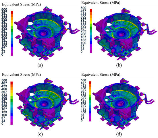 Equivalent stress field distribution of the flywheel housing with pressure holding time of 35 s: (a) test group No. 4; (b) test group No. 6; (c) test group No. 9; (d) test group No. 15.