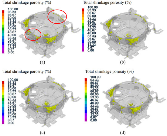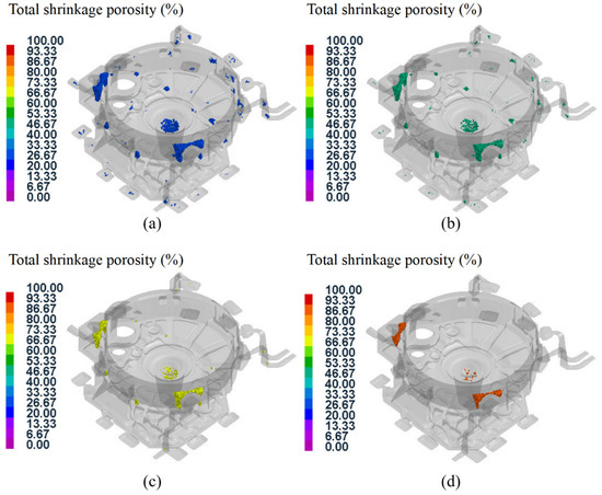 Due to the complex and large wall thickness differences in the structure of the flywheel housing component, it is easy to produce hot spots in the squeeze casting process, and this leads to defects such as shrinkage cavities and porosity in many regions. Figure 20 shows the distribution of the shrinkage cavity with different porosities in test group No. 1. It can be seen that the shrinkage cavity was mainly predicted at the left and right mounting ports, the cylindrical convex platform and the peripheral overflow groove, which was consistent with the results of the previous temperature field analysis. In addition, there were also defects at the corner junction with a large thickness variation, due to the uneven cooling contraction in this region [54,55]. The larger the porosity, the smaller the distribution area of defects on the casting. As shown in Figure 20d, for a porosity higher than 90%, defects were less distributed and mainly concentrated at the gate position and the mounting ports.