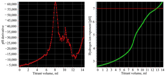 The content of sulfuric and phosphoric acids was calculated from the titration curves. The first point of equivalence corresponds to the neutralization of all sulfuric and phosphoric acids. The second point shows the neutralization of the second hydrogen ion of phosphoric acid. Separate titration of the first and second hydrogen ions phosphoric acid is possible due to a large difference in the values of the ionization constants of phosphoric acid in the first and second steps. This is because the titration results in a one-substituted and then a two-substituted salt of sodium phosphate. The substitution of the third hydrogen ion of the acid occurs without a visible titration jump due to the very small value of the ionization constant [27,28,29].