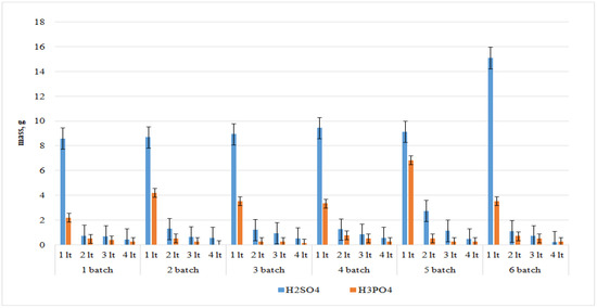 Figure 3 shows the results of the acid mass after washing PG depending on the washing batch. In each batch, 60 g of spent PG were weighed and washed according to the stoichiometric calculation for each reaction considered. It can be concluded that after the washing procedure about 13 g of sulfuric and phosphoric acids are washed out of 60 g of phosphogypsum. These acids represent 22% of the weight of the phosphogypsum leached, in total.