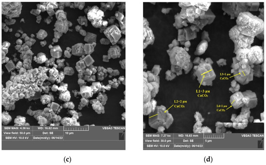 SEM micrograph of (a,b)—watered phosphogypsum, (c,d)—calcium carbonate obtained in the course of the conversion.