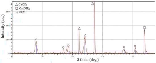 The chemical compositions of calcium carbonate determined by X-ray fluorescence are shown in Table 6. The minerals present in phosphogypsum were determined by the X-ray diffraction method. As shown in Figure 5, the samples contain calcium carbonate (CaCO3) and calcium hydroxide (Ca(OH)2) [35,36].