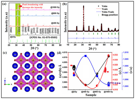 (a) XRD pattern of Bi:BT ceramic before (black line) and after gamma irradiation (coloured lines) measured at room temperature; (b) the XRD refinements of Bi:BT ceramic, with the observed data represented by black circles, the refinement profile by pink, and the difference between measured and calculated diffraction patterns by blue. P4mm Bragg reflections are shown in green; (c) a schematic of the crystal structure of the Bi:BT ceramics, blue circles represented the Ba/Bi atoms, yellow circles represented the Ti atoms and the red circles represented the oxygen atoms; (d) the variation in the lattice constants (a-parameter in black line) & c-parameter in red line) and tetragonality (c/a in blue line) with gamma dose.