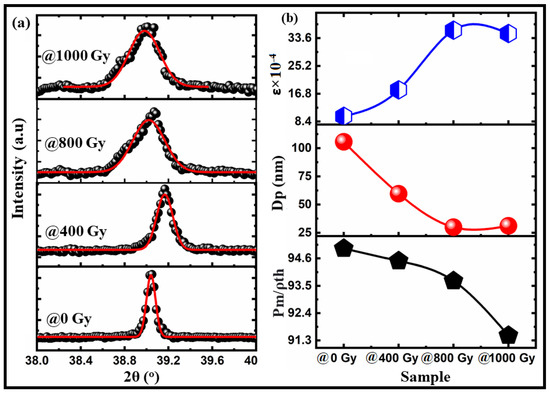 (a) A Gaussian fitting of the (111) plane for Bi:BT ceramics irradiated with different gamma doses; (b) the variation in crystallite size, lattice strain, and relative density of Bi:BT ceramics irradiated with different gamma doses.