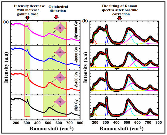 (a) The Raman spectra of Bi:BT ceramics before (black line) and after (red, blue, and pink lines) gamma irradiation; (b) the fitting of the Raman spectra (black color) to the Gaussian-Lorentzian function (red-color) measured at room temperature.