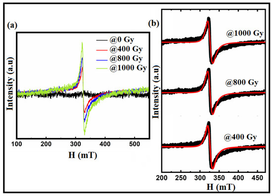 (a) EPR spectra of the Bi:BT samples before and after gamma irradiation; (b) the Lorentz fitting (in red lines) of the resonance spectra (in black color) for the irradiated samples at 400 Gy, 800 Gy, and 1000 Gy as measured at room temperature.