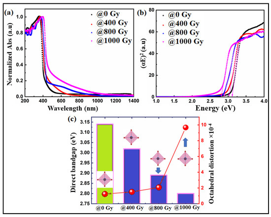 (a) UV–vis absorption spectra and (b) Tauc plot of the Bi:BT ceramics before (black line) and after (colored lines) gamma irradiation; (c) correlation between the bandgap and octahedra distortion in the Bi:BT ceramics before (green shadow) and after (blue shadow) gamma irradiation.
