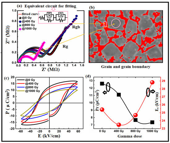 (a) Cole–Cole plots for the Bi:BT samples before and after gamma irradiation measured at room temperature and fitted using an equivalent circuit consisting of two RQ elements, as shown in the inset graph; (b) representation of the grain (grey) and grain boundary (red); (c) relationship between the polarization and electric field measured at 10 Hz for all samples before and after gamma irradiation at room temperature; (d) correlation between remnant polarization (in black line) and coercive field (in red line) with gamma dose irradiation.