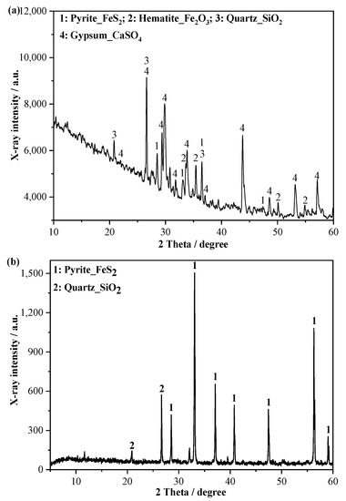 However, sulfides are often associated with copper ores. Some of the copper tailings are sulfate-rich copper tailings (SRCTs) with excessive sulfur contents. Pyrite is one of the most common sulfides in SRCTs. It is reactive and can be easily oxidized to sulfate ions, resulting in acid mine drainage (AMD) [4] through a general reaction as expressed in Equation (1) [5,6,7],