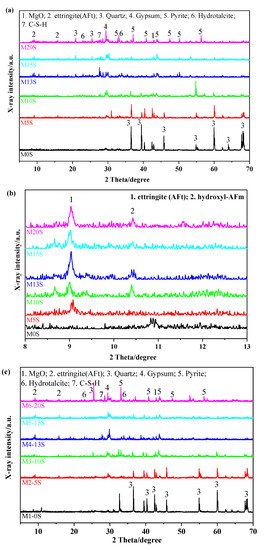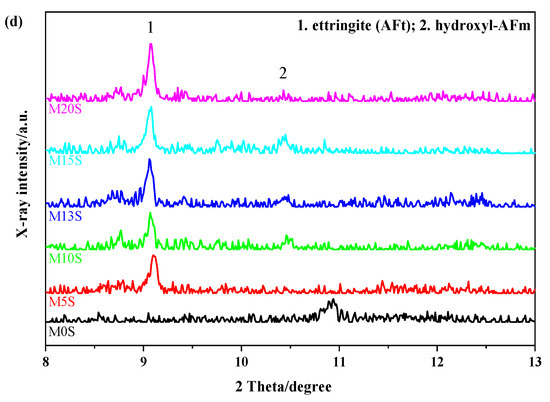 Figure 2c,d presents a similar trend in forming sulfate-containing hydration products in the mortars with SRCTs. The presence of MgO suggests the hydrolysis of MgO was still not complete after 28d of curing, as shown in Figure 2c. Less MgO was found in the mortars prepared with higher sulfur contents. This is because the hydration of slag could have been accelerated by the synergistic effect between the generated sulfates through the oxidization of pyrite and MgO, which in turn resulted in more consumption of MgO. In addition, M-S-H gel was not observed in these spectra due to its poor crystallinity [29].